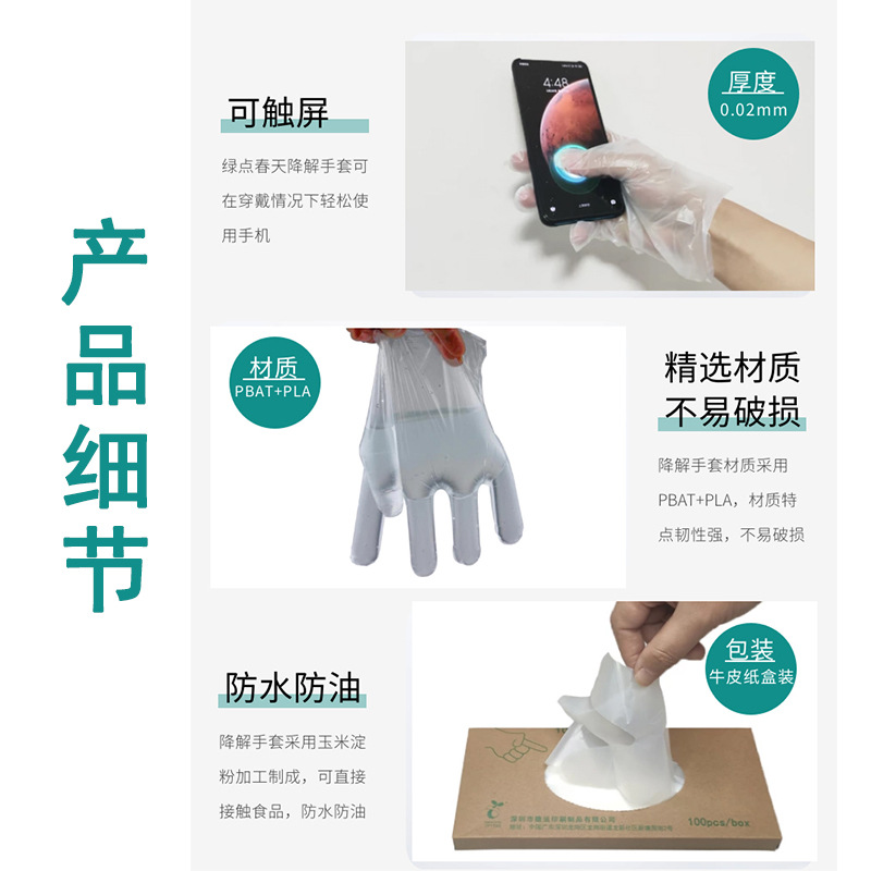 精選材質不易破損(sǔn),本降解手套材(cái)質采用PBAT+PLA材質,材質特點韌性強,不易破損。